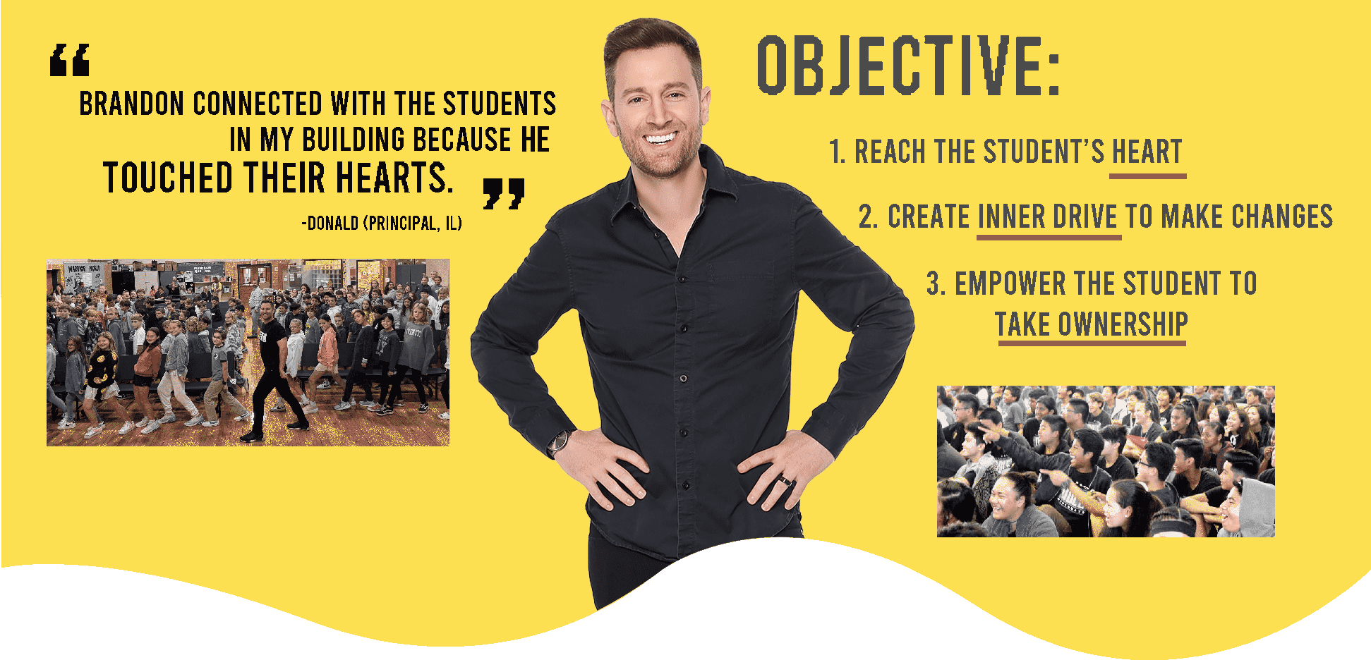 Brandon’s presentations are designed to resonate with students, addressing issues such as self-confidence, leadership, character, mental health, and more. Brandon combines entertaining dancing, heartfelt storytelling, and engaging crowd participation to create positive change in young people. For example, Brandon often has students in the room take the lead by standing up in front of their peers to thank a teacher in-person. Brandon Lee White is a guest speaker for schools who receives rave reviews from all types of audiences.